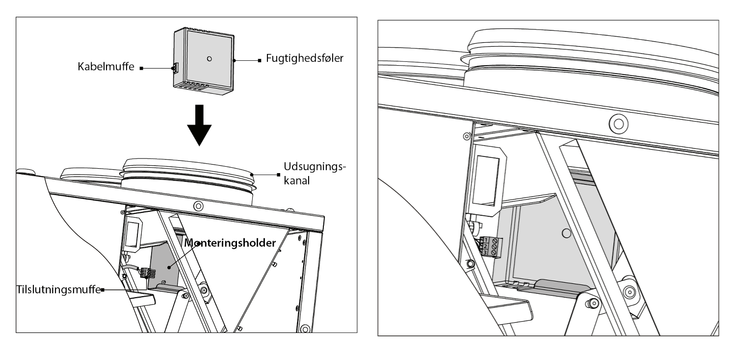 Fuktsensorn är monterad i utblåset från höljet enligt bilden nedan.